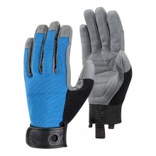 Fast Rope Gloves, Made of double-layer leather glove, Fourway stretch nylon back for moisture control on sweltering crag days, The hook-and-loop neoprene cuff features a carabiner hole, so you can attach the Cordex to your harness after your buddy finishes flailing on his project.